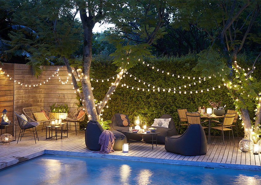 Unul dintre scopurile iluminatului grădinii este acela de a crea mai multe zone în grădină, evidențiind zonele cheie precum spațiile de relaxare sau de luat masa. Instalațiile de lumini adaugă un efect magic instantaneu. Aranjează-le în jurul baldachinului, de-a lungul unui gard pentru a înveseli un fundal simplu sau în jurul unui copac pentru o atmosferă cu adevărat magică.