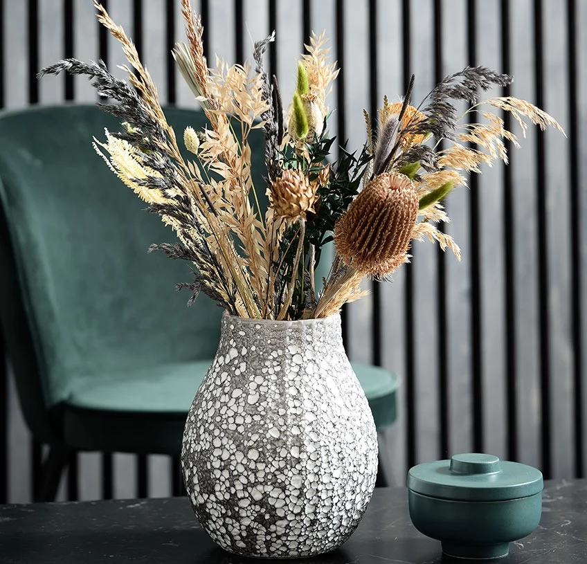 Dacă ești în căutarea unei vaze pe care să o așezi pe podea, alege una care să fie înaltă, de cel puțin 30 cm și care să ofere multă