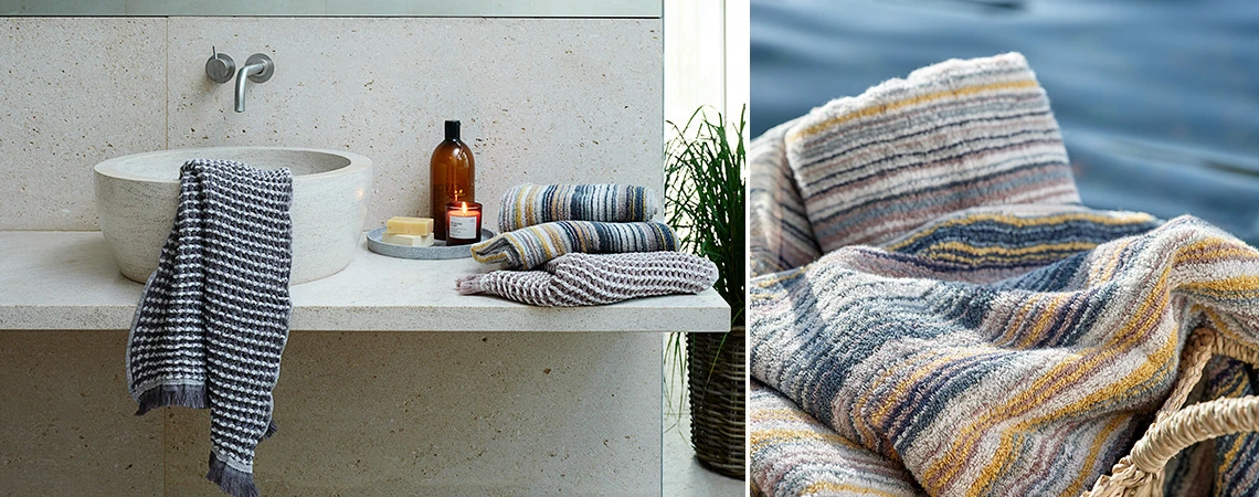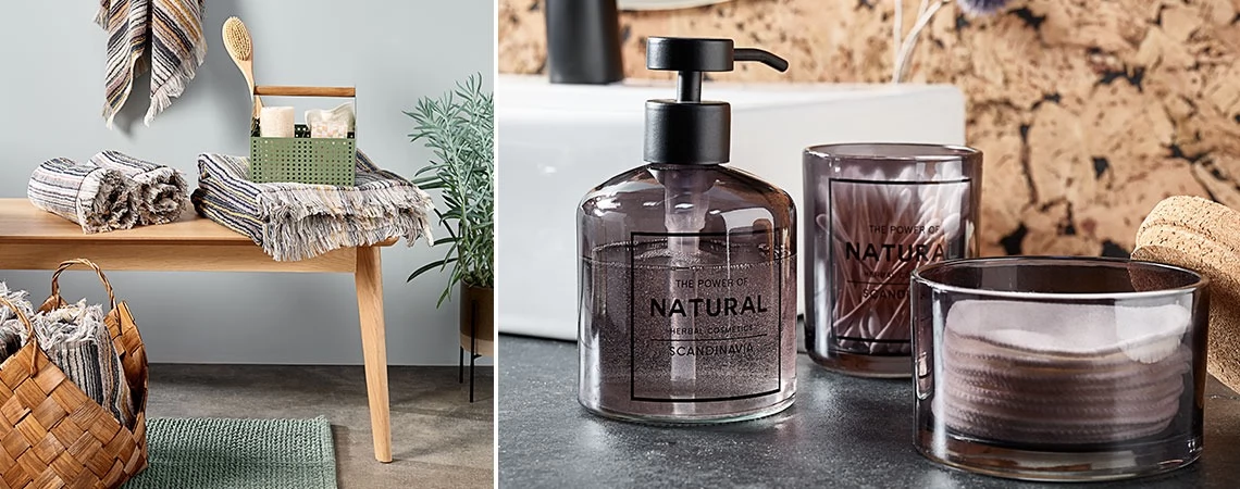 Transformă-ți baia într-un SPA natural cu prosoape de bumbac în tonuri de pământ și decorațiuni cu forme organice.
