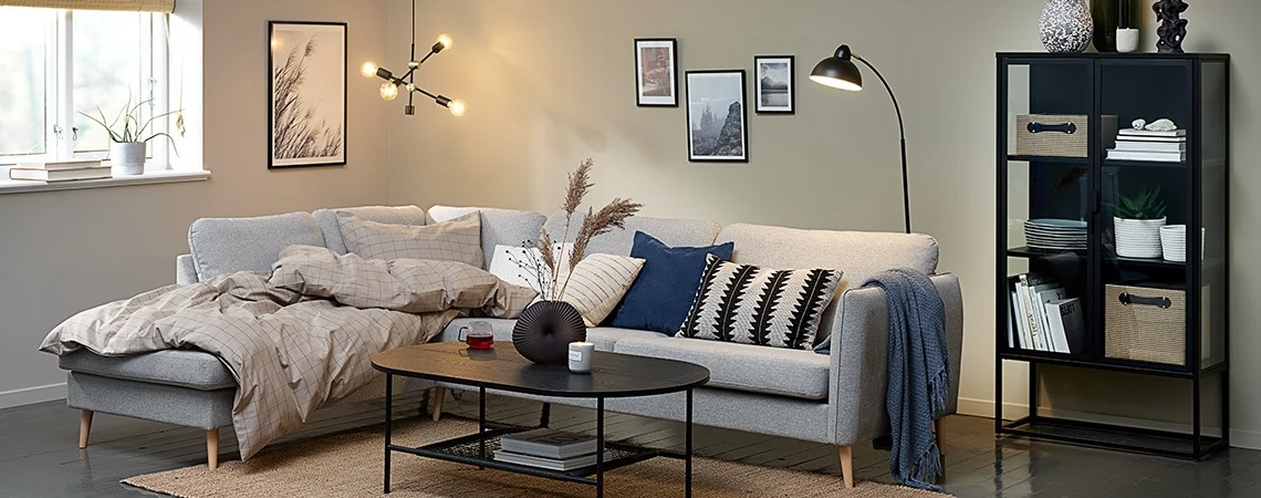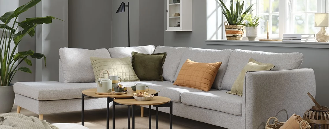 O canapea sau un colțar, pernele decorative în diferite modele și culori și sursele de iluminat sunt elemente importante atunci când îți dorești o atmosferă hygge în camera de zi.
