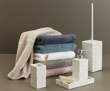 La JYSK vei găsi tot ce ai nevoie pentru baie. Avem prosoape într-o mulţime de culori, combinaţii de materiale şi mărimi, la cele mai bune preţuri, precum şi o gamă extinsă de accesorii cu aspect elegant, covorașe de baie, halate și papuci, oglinzi, perdele de duș, coșuri de rufe, uscătoare de rufe, dozatoare de săpun, suporturi pentru periuța de dinți, rafturi pentru baie, uleiuri parfumate, coșuri de gunoi, perdele de duș .